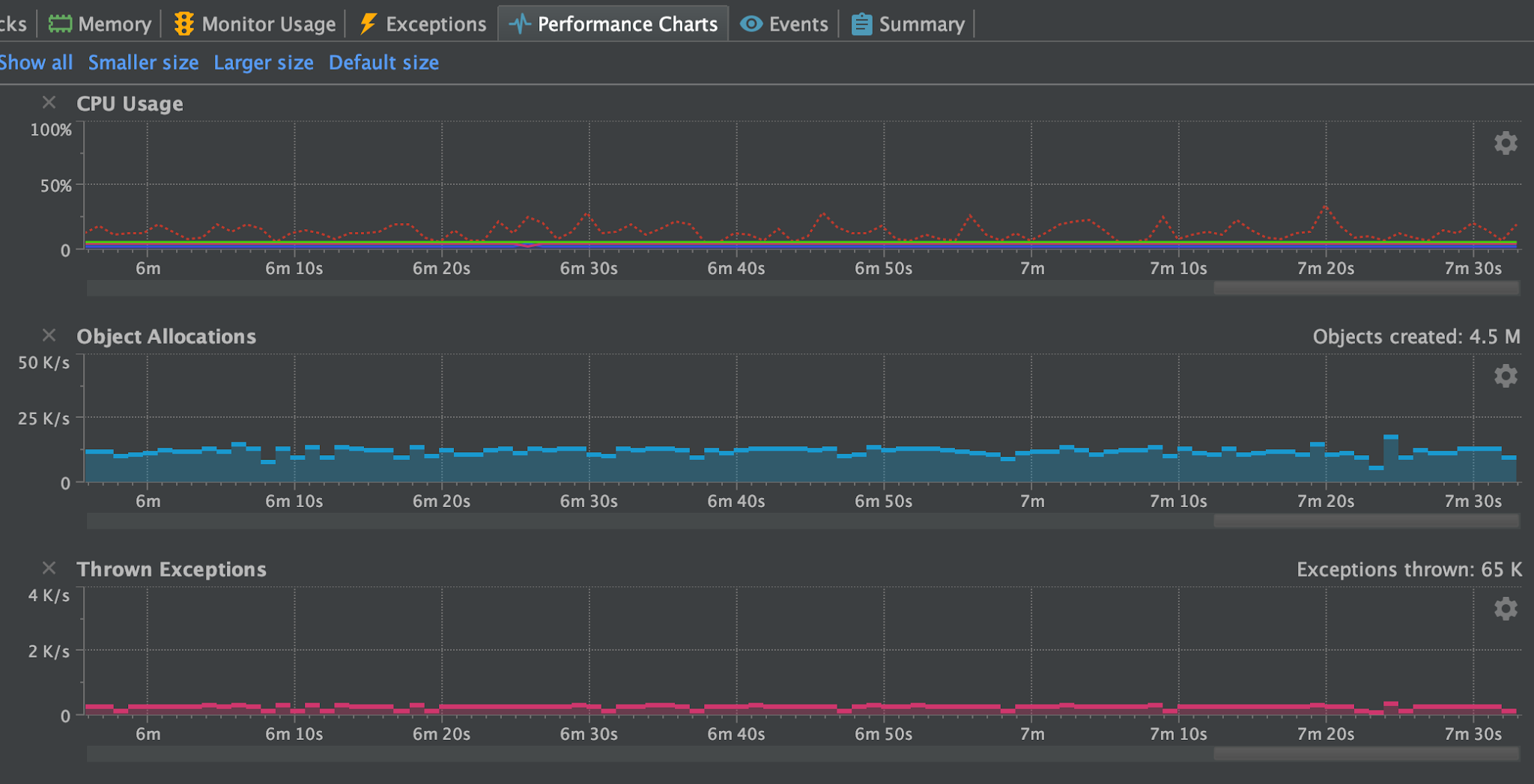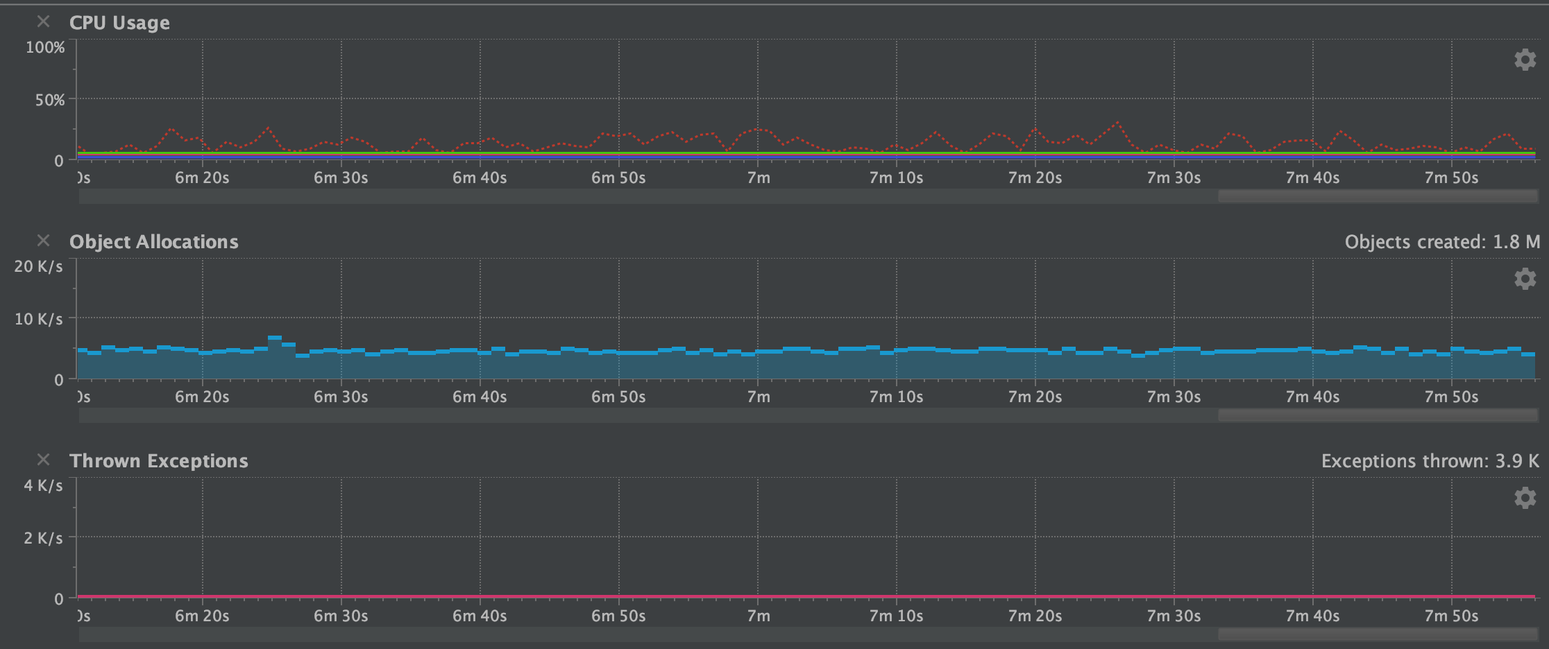 The screenshots below show a chart with the CPU, object allocations, and thrown exceptions.